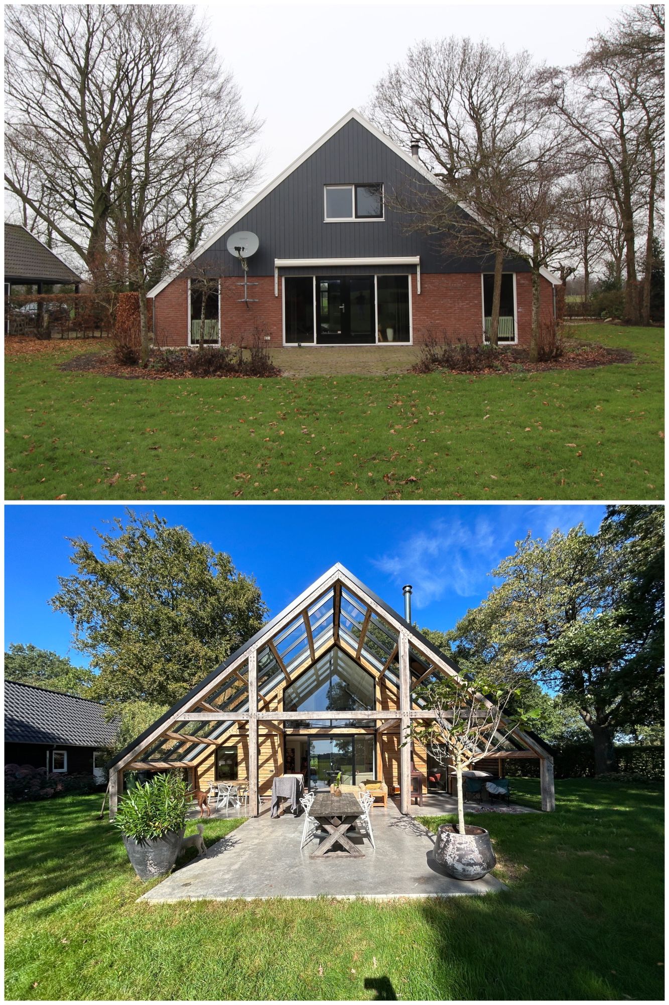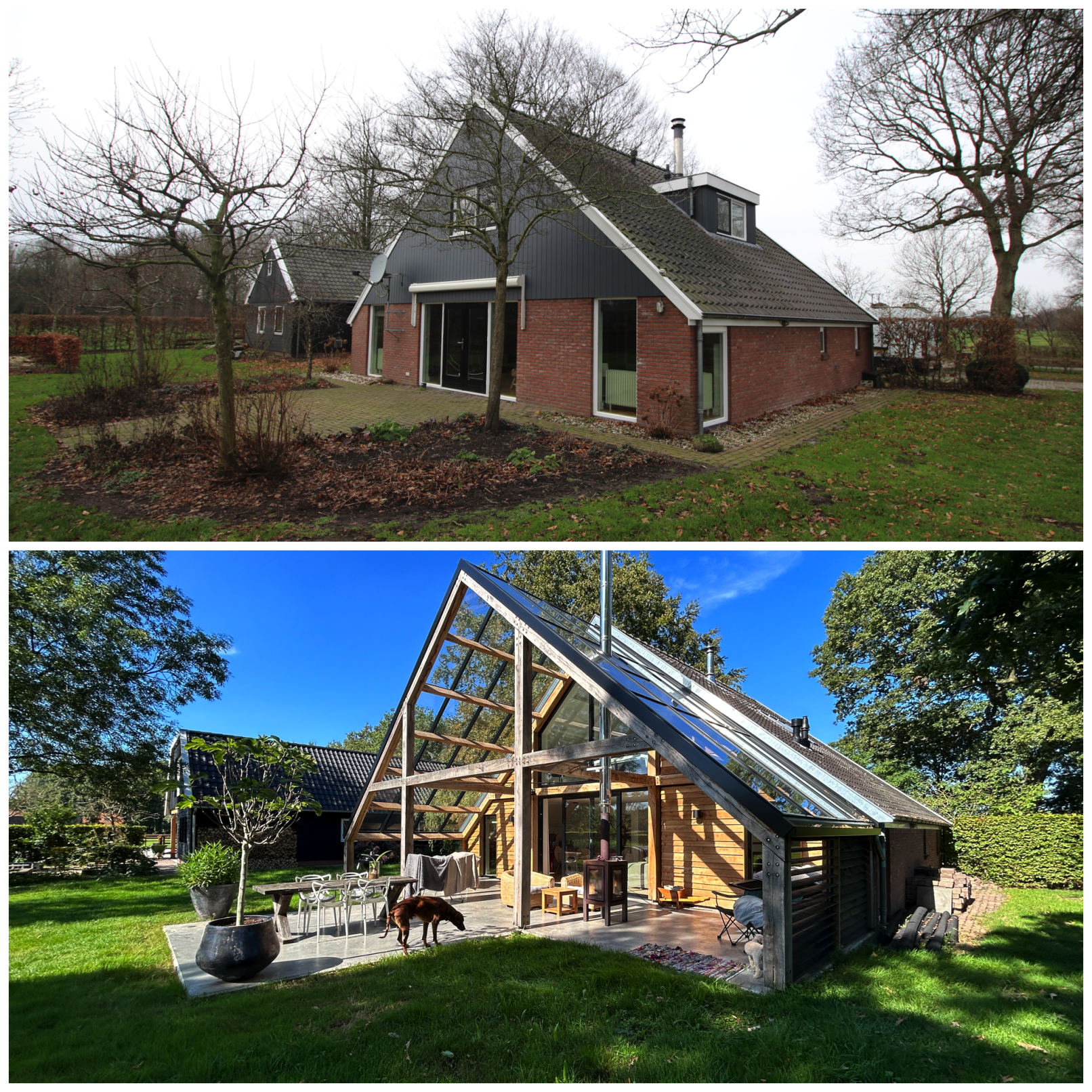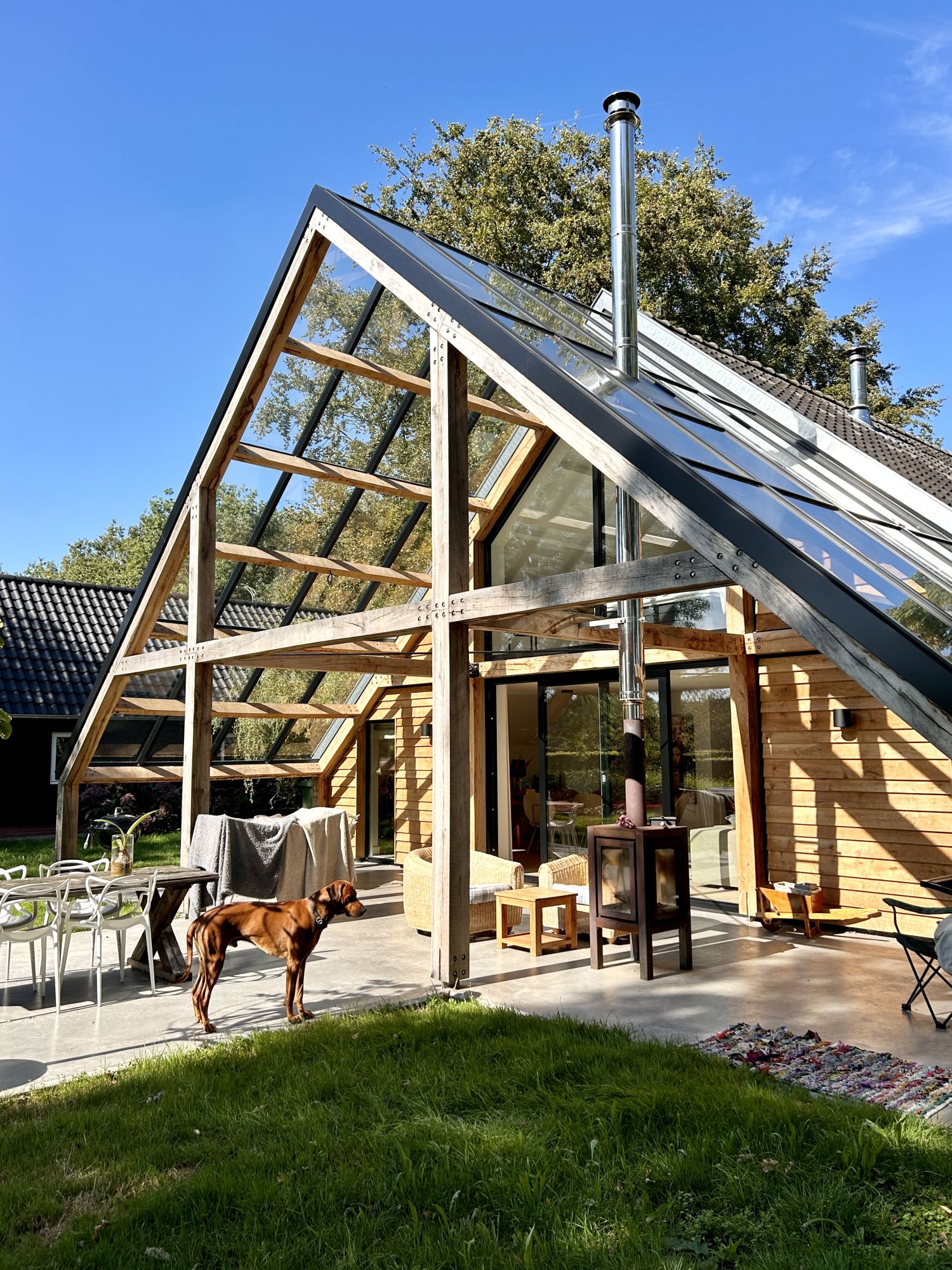 Een glazen overkapping, op basis van houten spanten als verwijzing naar de gebintstructuur, biedt nu ruimte aan een unieke binnen-buiten beleving door de seizoenen heen.