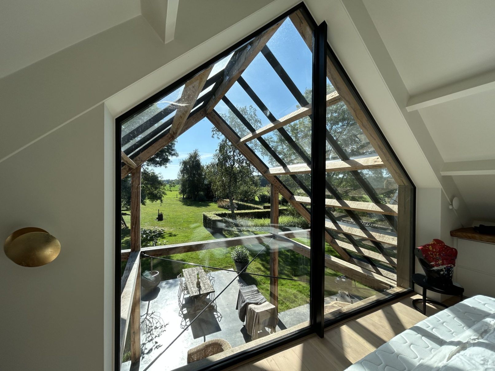 Het weidse landschap is na verbouw van deze, aanvankelijk introverte woonboerderij, een verlengstuk van het interieur geworden.